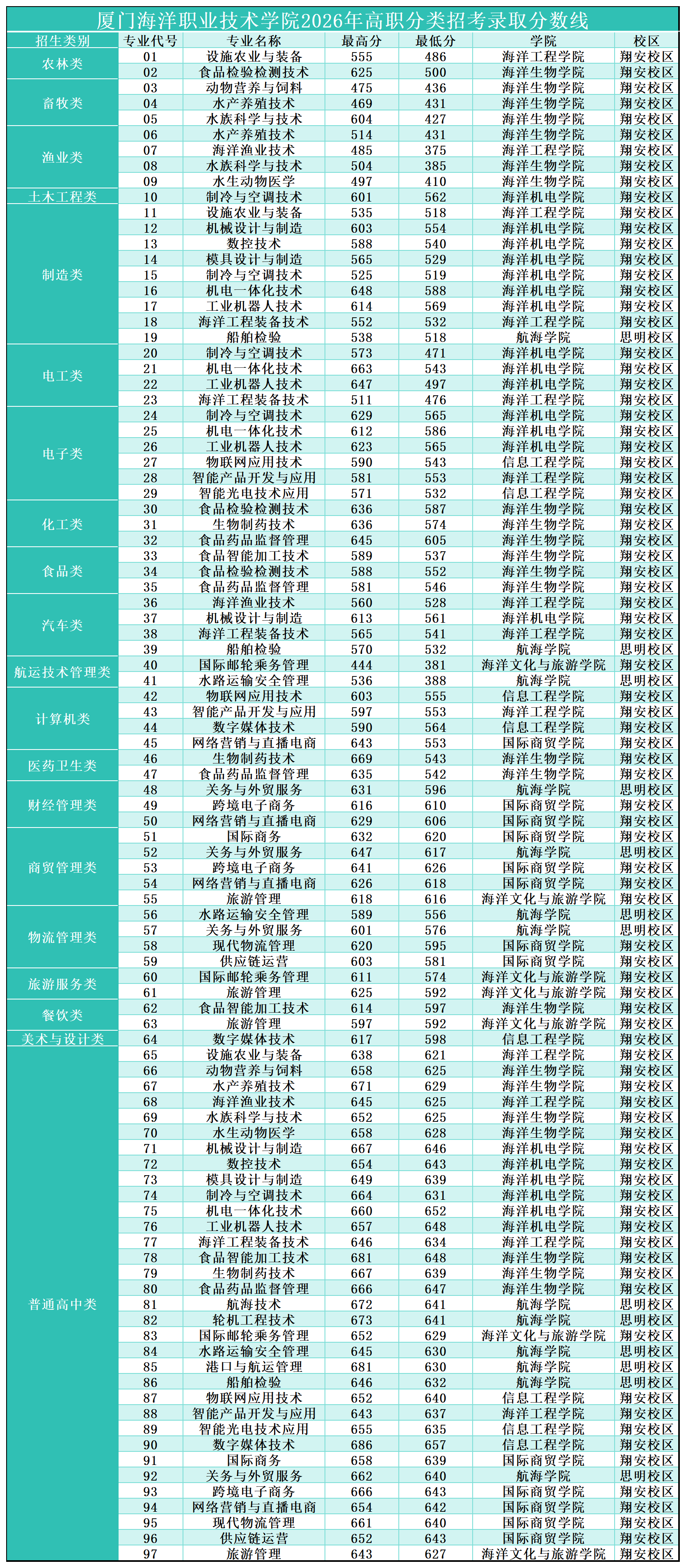各类别及专业招生录取的投档分总体持续走高,普通高中类33个专业录取的最低621分,录取最高分为686分。